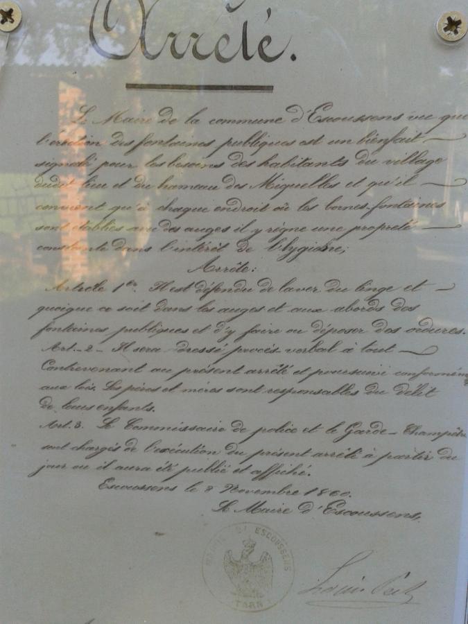 Arrêté commune d'Escoussens du 9 novembre 1860 sur l'utilisation des fontaines publiques
